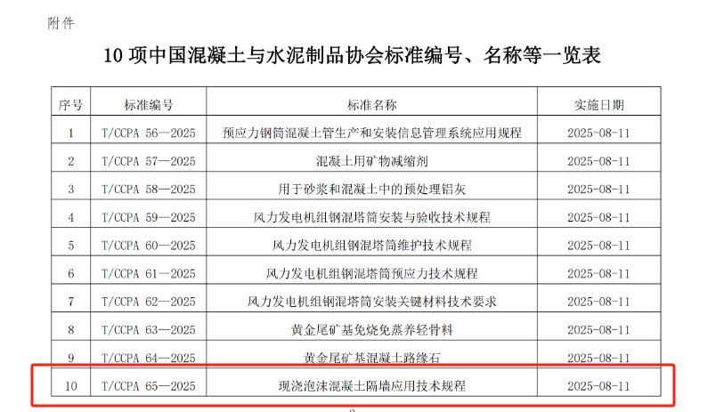 2025年4月11日,中國混凝土與水泥制品協(xié)會正式批準(zhǔn)發(fā)布了《現(xiàn)澆泡沫混凝土隔墻應(yīng)用技術(shù)規(guī)程》(T/CCPA 65—2025)等10項協(xié)會標(biāo)準(zhǔn)。該標(biāo)準(zhǔn)由我司主導(dǎo)編制,標(biāo)志著我司在泡沫混凝土技術(shù)領(lǐng)域的領(lǐng)先地位和行業(yè)貢獻(xiàn)得到了權(quán)威認(rèn)可。